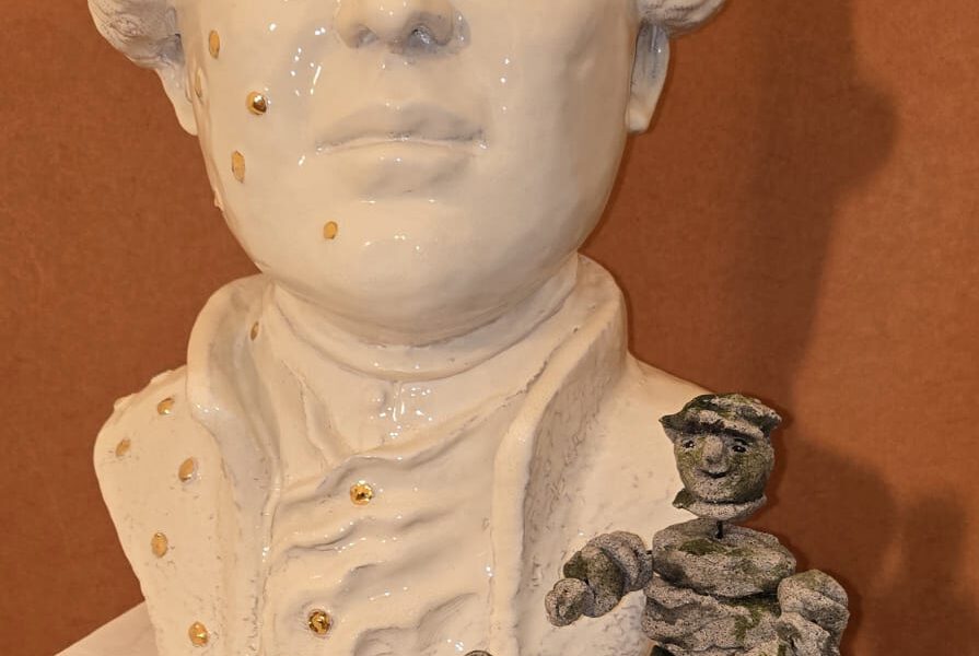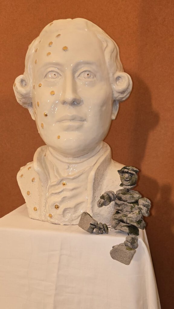 Der aus der Nähe von Bologna stammende Idilio Galeotti war einen Monat lang Stipendiat des VIA REGIA Artists in Residence Programms in Königshain und hat diese Büste von Schachmann aus Keramik geschaffen. Wie ihr schon aus diversen Ausstellungen und Aktionen in diesem Jahr wisst, setzte Schachmann sich für die Menschen ein, brachte deutliche Verbesserungen in ihrem täglichen Leben, war naturwissenschaftlich bewandert und führte Neuerungen ein, begeisterte sich für Kunst und Kultur, malte und zeichnete selbst. Nicht zuletzt ist das Schloss Königshain auf seinen eigenen Entwurf zurückzuführen. Mit den goldenen Punkten wollte Galeotti die Ausstrahlung Schachmanns ausdrücken, eine Lichtgestalt seiner Zeit. Jeder Punkt ein Lichtblick.